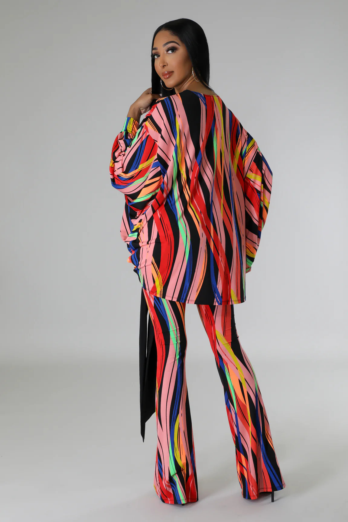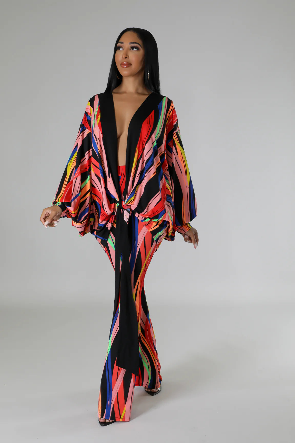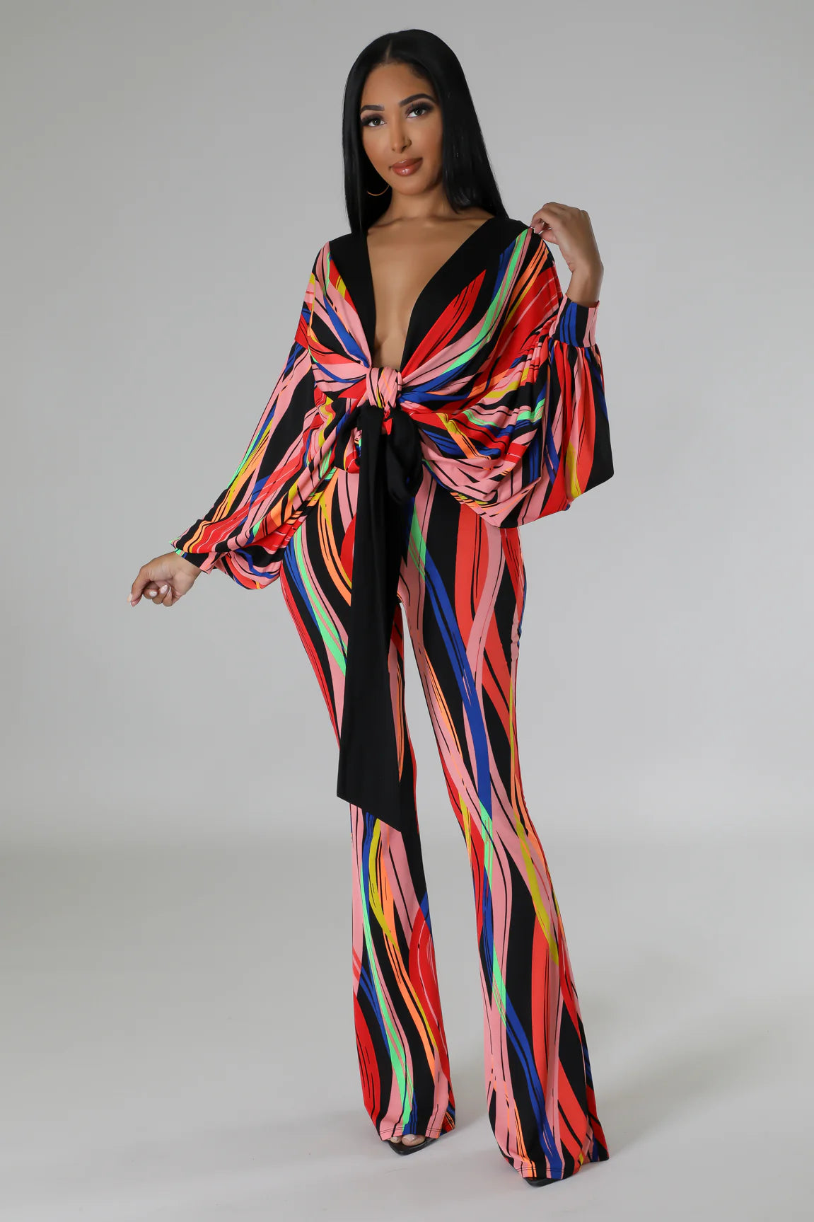 Stretch pants set,Deep V neck, Long sleeve, Self tie closure, High-waisted pants, Elastic waistband.